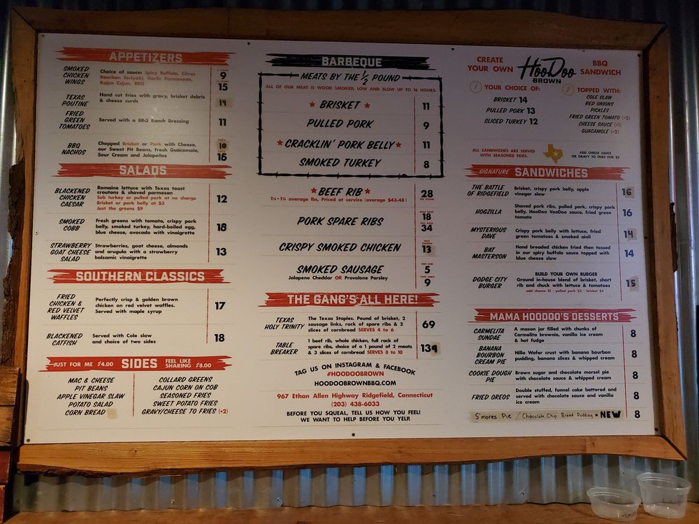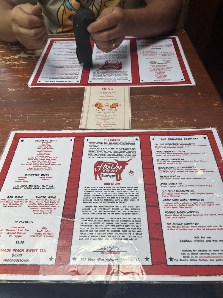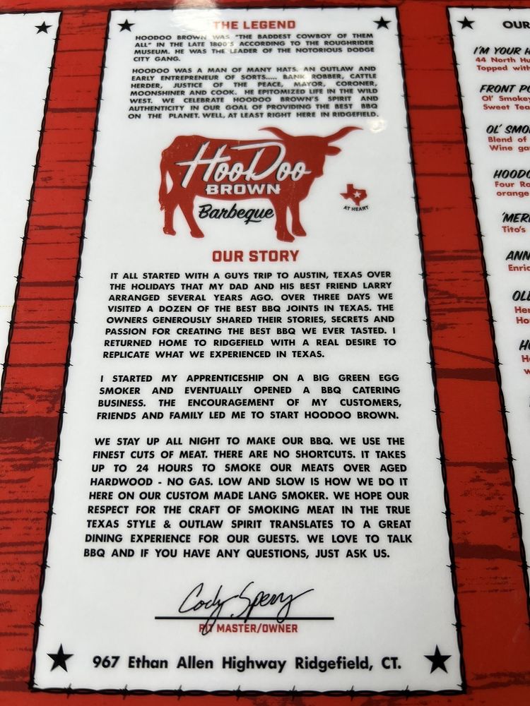 Welcome to Hoodoo Brown BBQ, where authentic Texas BBQ meets a warm and inviting atmosphere. Nestled in Ridgefield, CT, this establishment excels in both flavor and experience, serving up a mouthwatering menu that showcases perfectly smoked meats from their impressive backyard smokers. Diners rave about the top-notch brisket, hailed as almost as good as what you’d find in Texas itself.